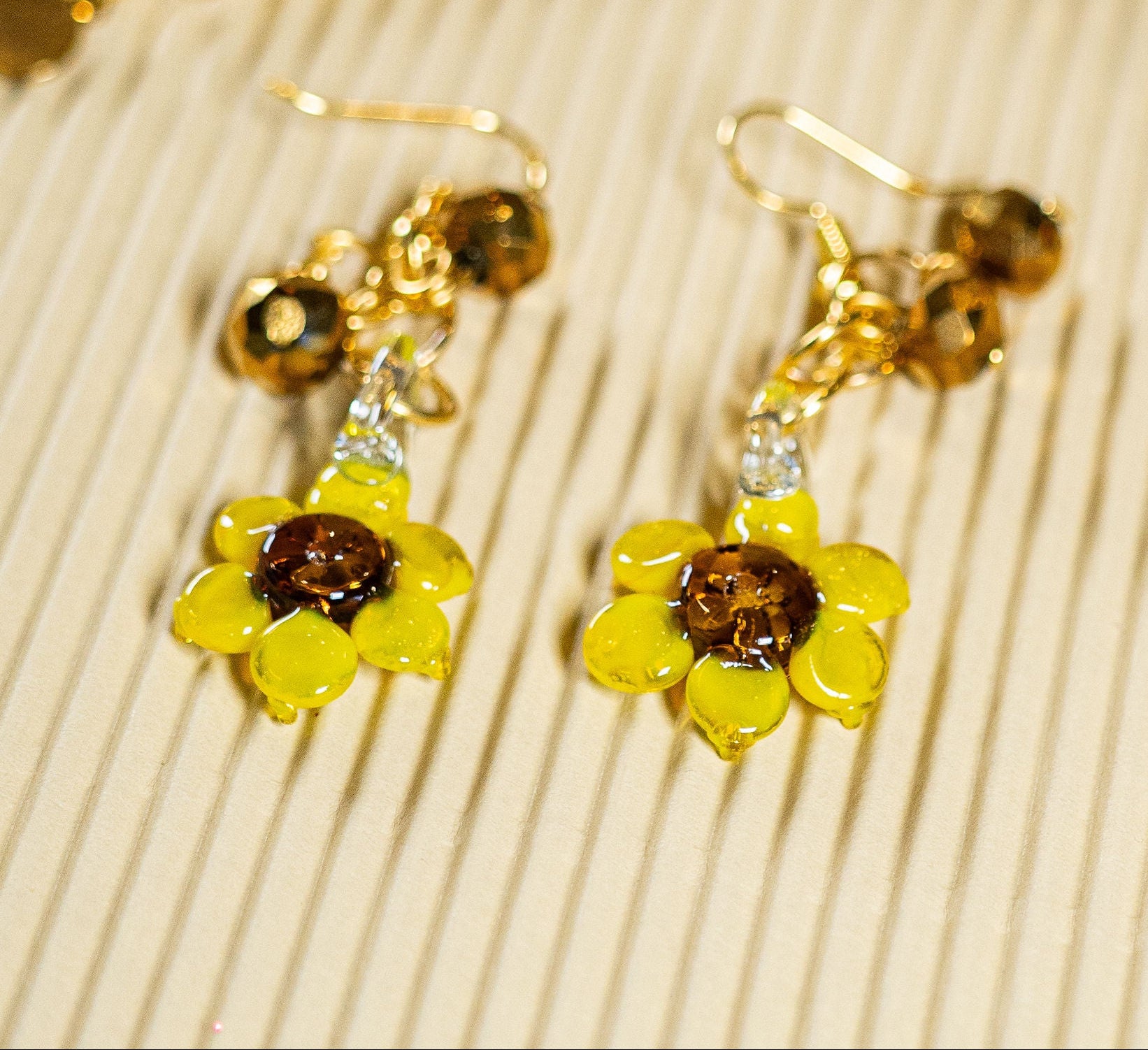 -Arete de gancho acero inoxidable color dorado, dona facetada metalica y dije de vidrio soplado en forma de girasol.