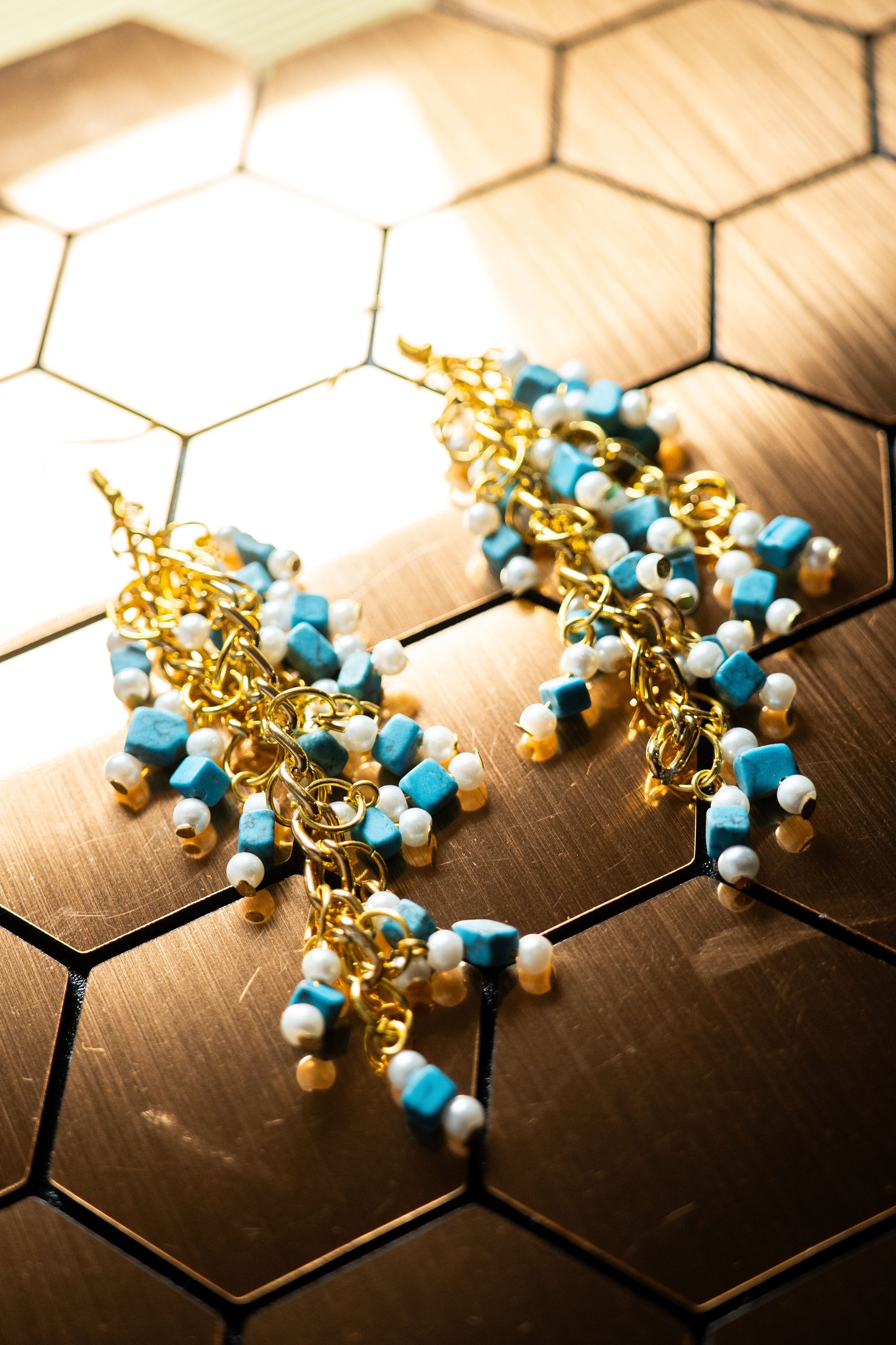 -Aretes tipo gacho color dorado con cuentas de turquesina y perlas de cristal en tiras con argollas pequeñas tipo pewter.