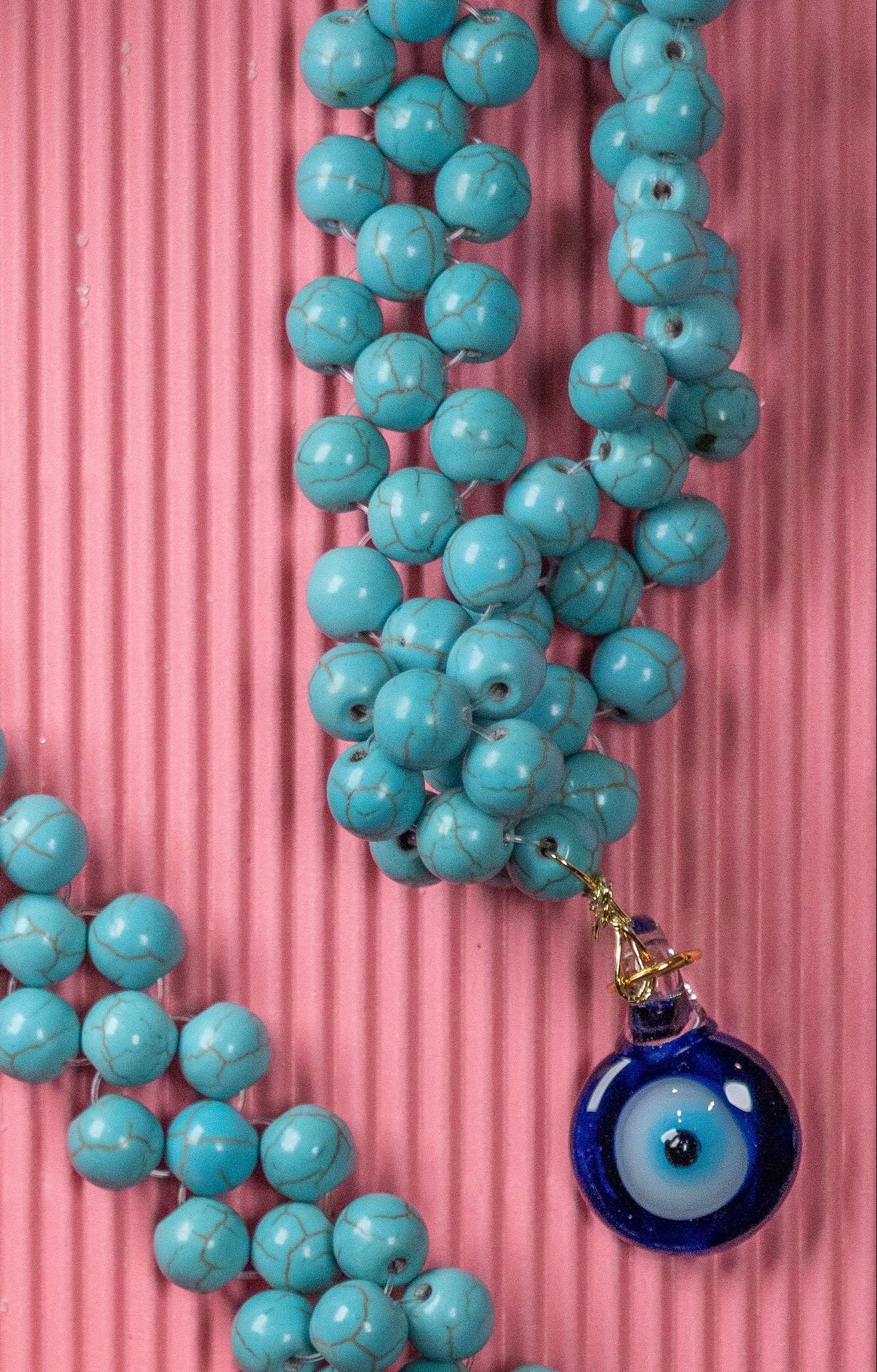 -Turquesina azul, entrelazado en nylon, dije de Ojo en vidrio soplado, cierre de gancho.