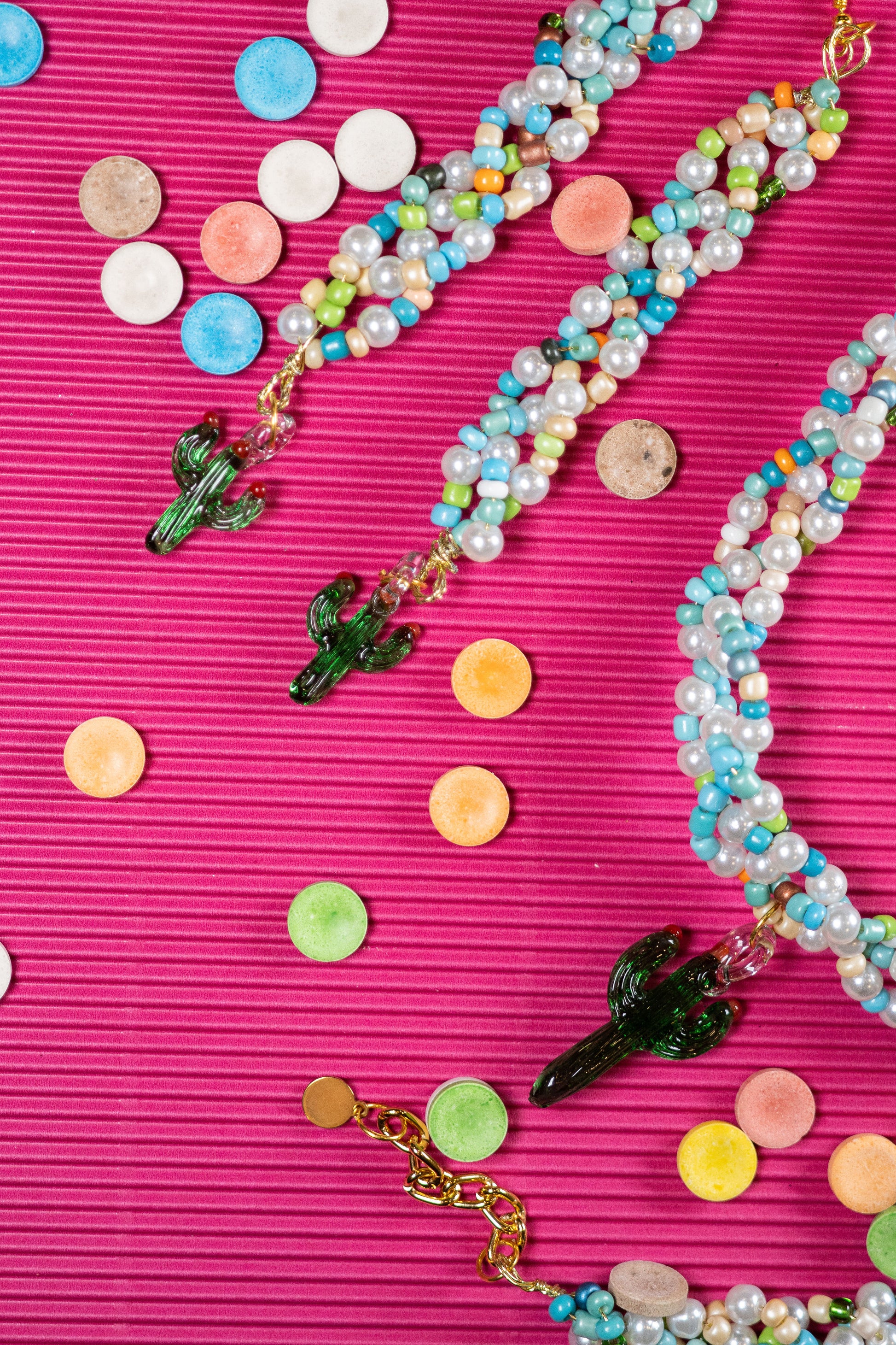 -Collar tipo gargantilla de chaquirón y perla de cristal en colores diferentes, diseño de tejido en nylon, dije en forma de cactus de vidrio soplado y cierre de gancho.