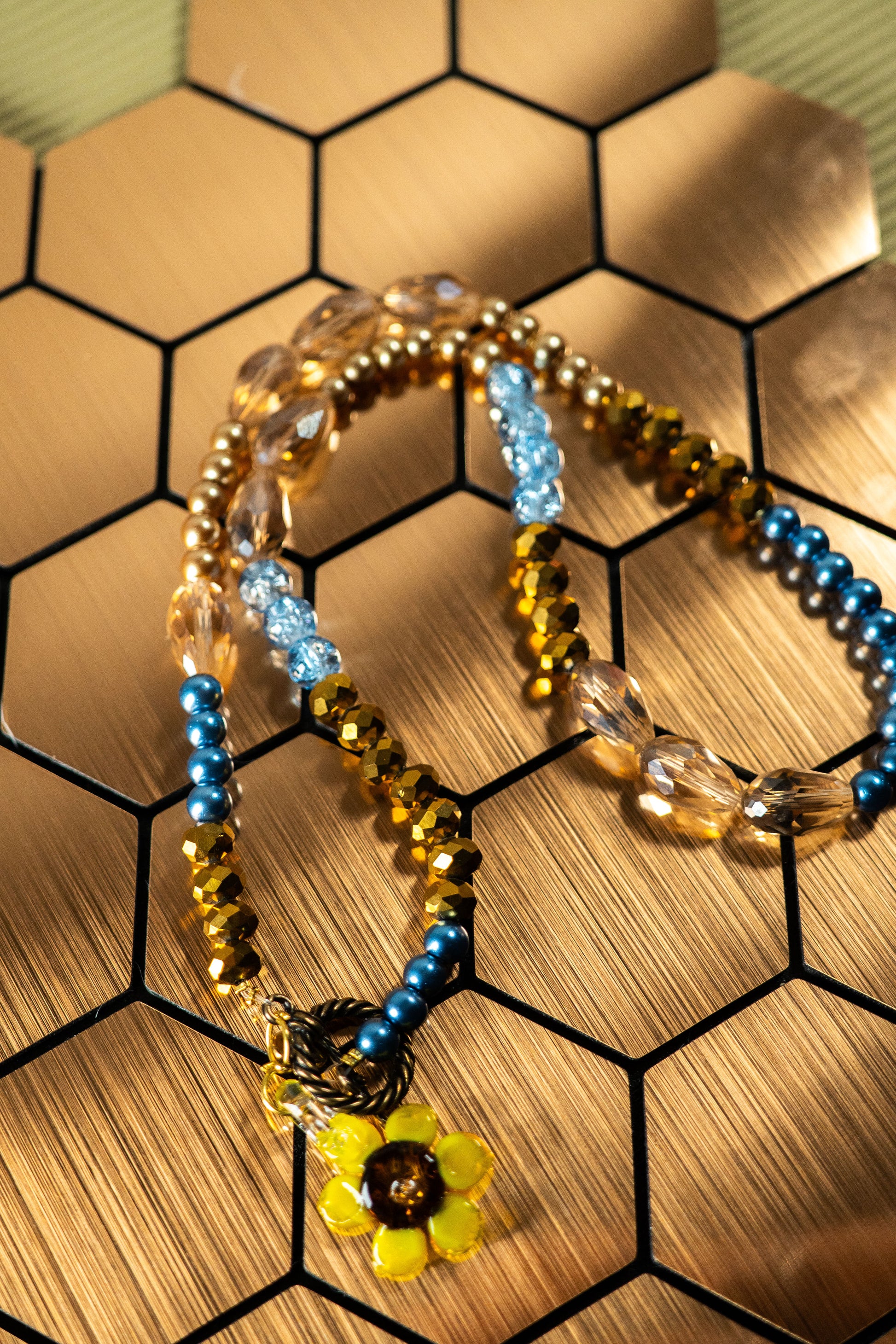 -Collar de nylon con dona, perla y gota facetadas en tonos trasparentes y metálicos, craquelado, con broche marinero o toggle, con dije de vidrio soplado en forma de girasol.