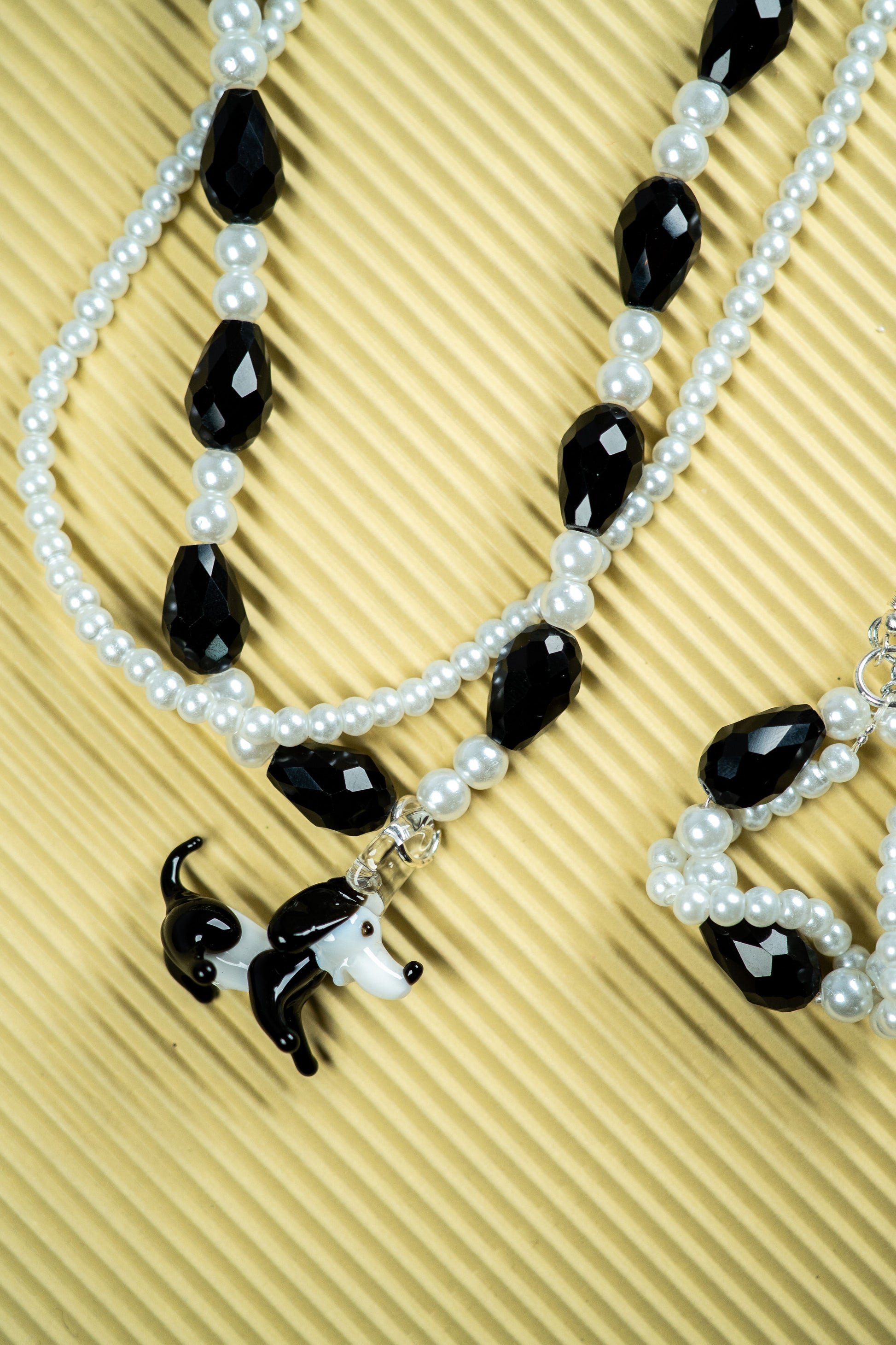 -Collar doble de perla blanca de cristal, gota facetada de cristal, dije de perrito en blanco y negro de vidrio soplado, cierre de gancho color plata.
