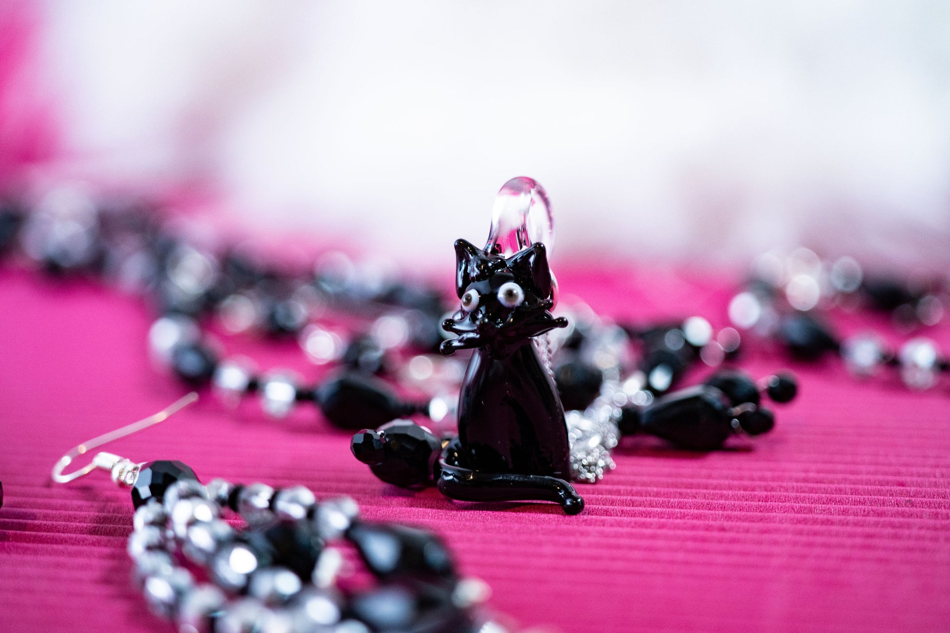 -Collar doble de cadena de acero inoxidable en tono plata y nylon con detalles de dona y gota facetada en diferentes tamaños color negro y transparente, detalles de argollas pewter en tono plata, dije de vidrio soplado en forma de gato negro y cierre de gancho.