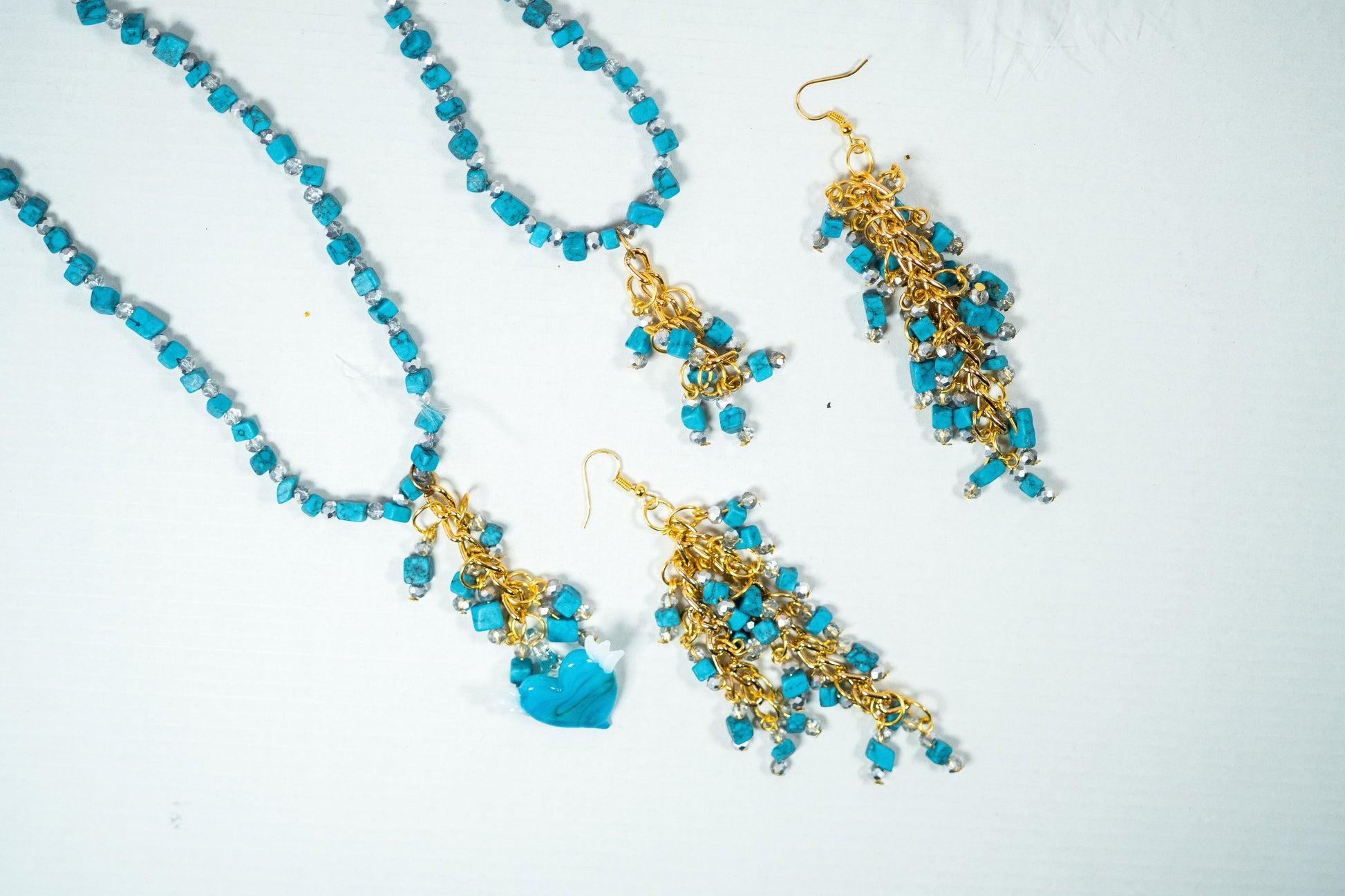 -Pulsera con nylon con cuentas de turquesina con dona facetada en tono metálico, con un detalle de colgante y cierre de gancho